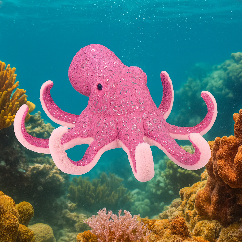 Med sine åtte krøllete armer og strålende rosafarge glitrer denne blekkspruten som en ekte havprinsesse! Den er både leken og stilig, med skinnende detaljer og et mykt uttrykk som inviterer til eventyr under havet. Perfekt for barn som elsker havdyr, farger og litt ekstra glitter i hverdagen.