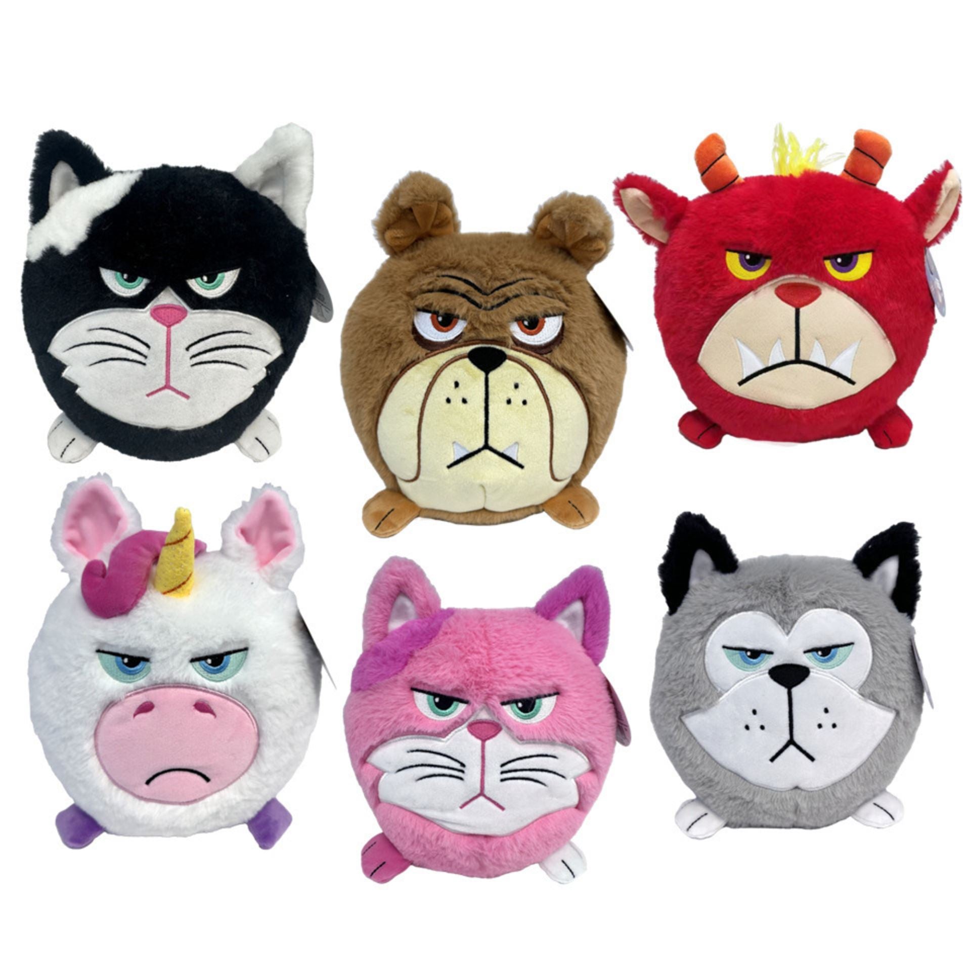 Hangry Petz er laget med myk plysj og fylt med slitesterkt materiale som tåler både kos og latter. Hver figur har sin egen personlighet – fra sur enhjørning til sinna bulldog og småirriterte katter.