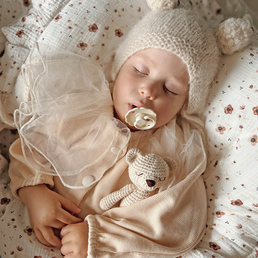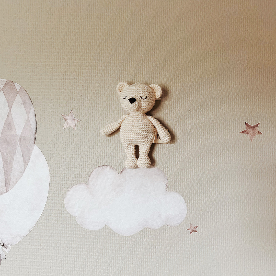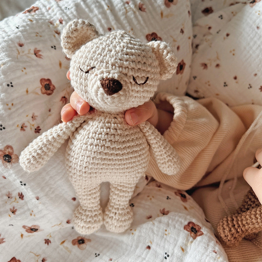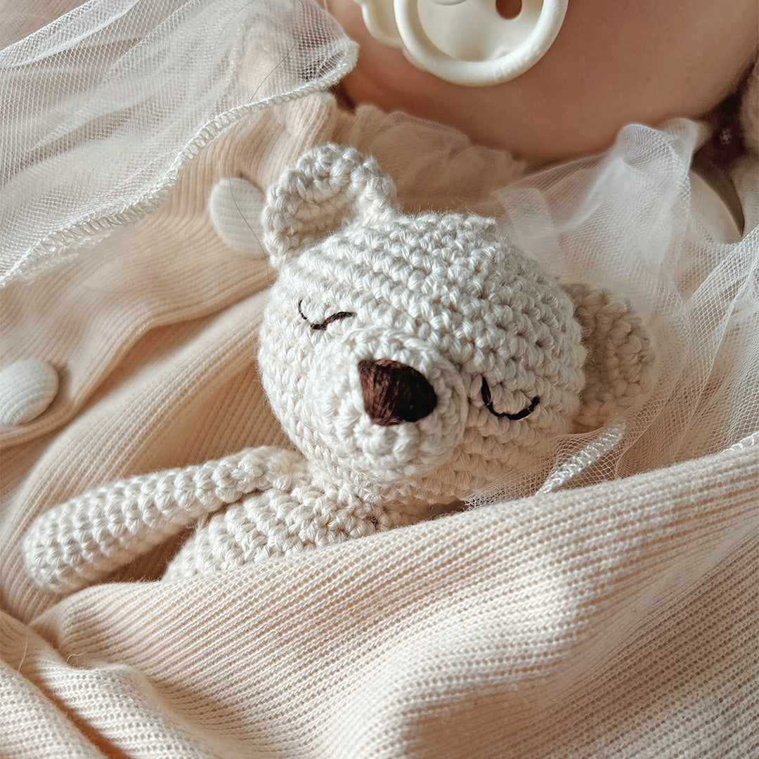 En liten, håndheklet bamse med sovende øyne og rolig uttrykk – perfekt som første kosevenn, til vogna eller som en trygg trøster ved leggetid. Den myke, taktile heklestrukturen inviterer til kos og små hender som vil utforske, og den nette størrelsen gjør den lett å ta med overalt.