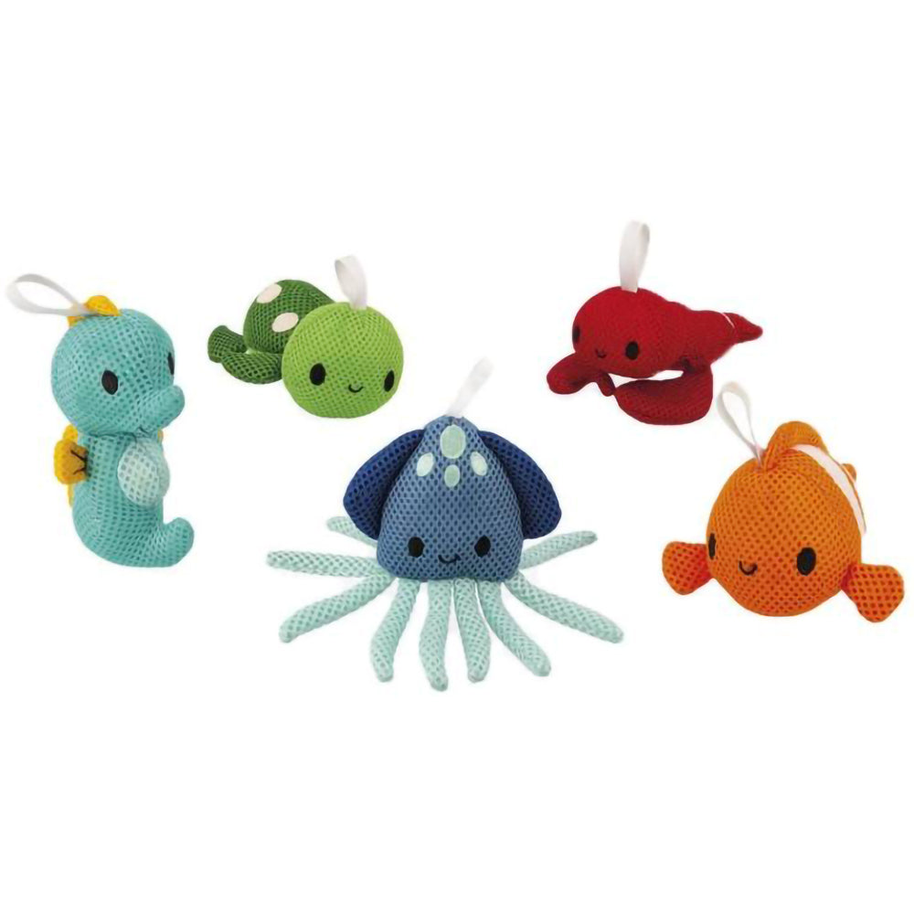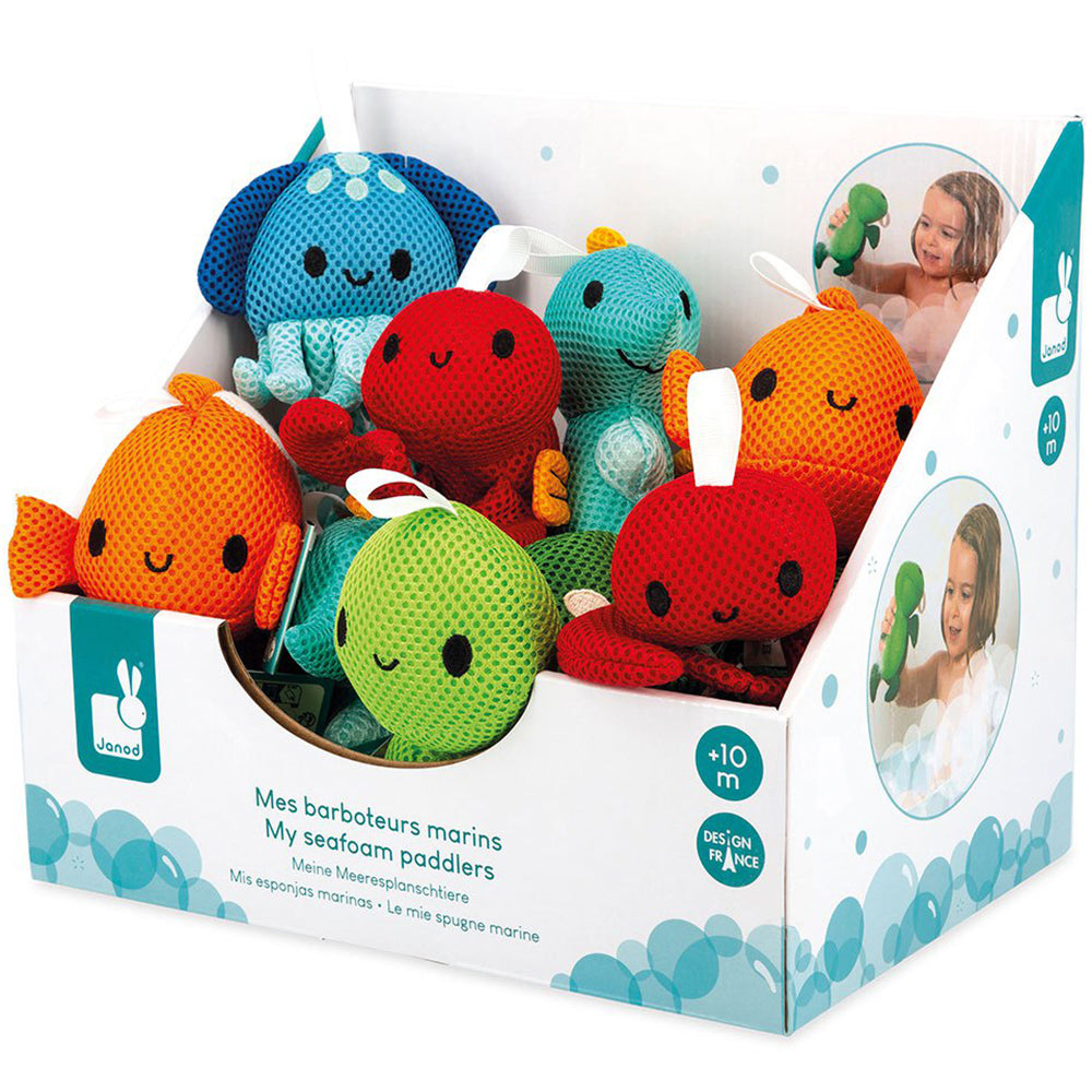 Gjør badetiden morsom og fargerik med My Seafoam Paddlers – et sett med tre søte badesvamper fra Janod for barn formet som havdyr! Settet inneholder en klovnefisk, en blekksprut og en hummer, laget i mykt nettingmateriale som er trygt for små hender og perfekt for både lek og vask.