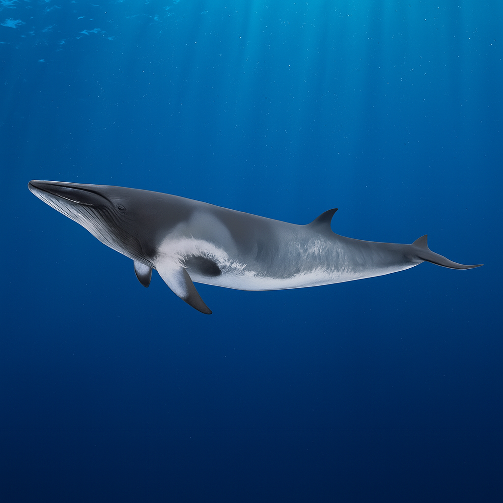 Minke-hvalen er kjent for sine raske dykk, typisk 3–5 åndedrag før den dykker i flere minutter, noe denne modellen reflekterer gjennom sin kroppsholdning og form.